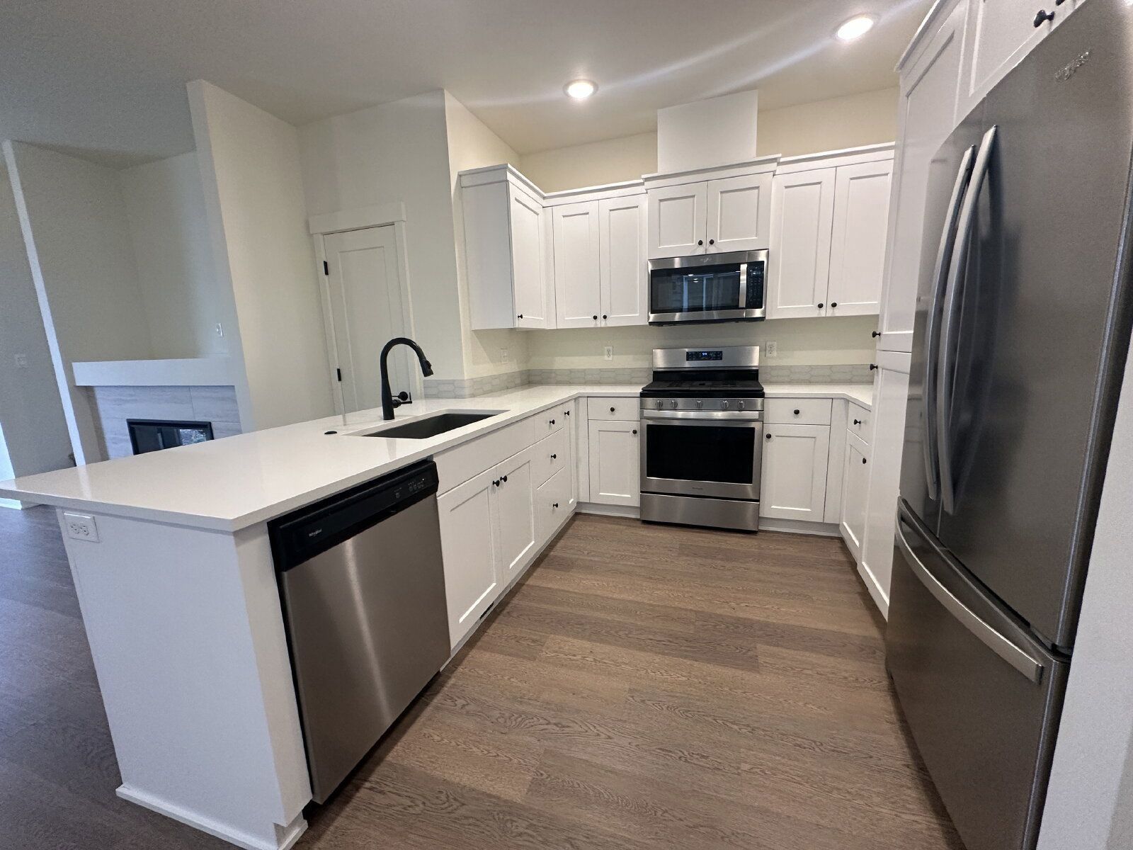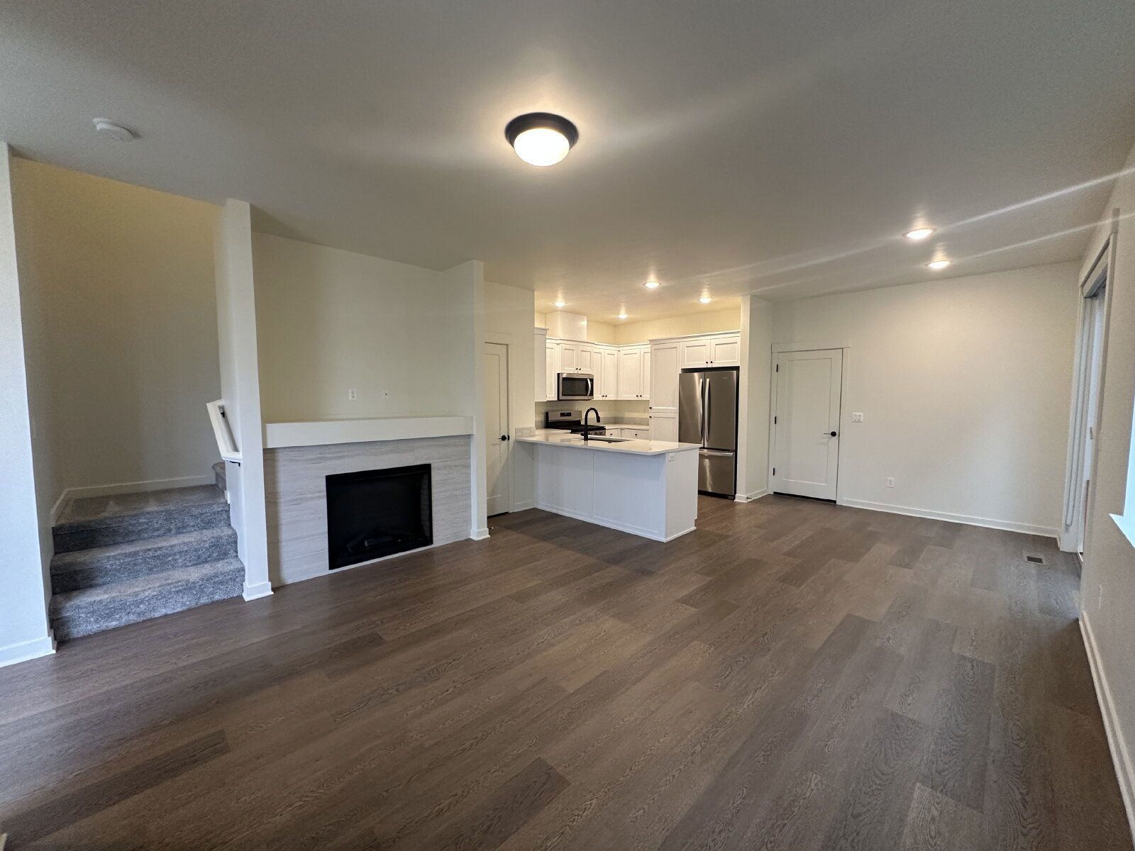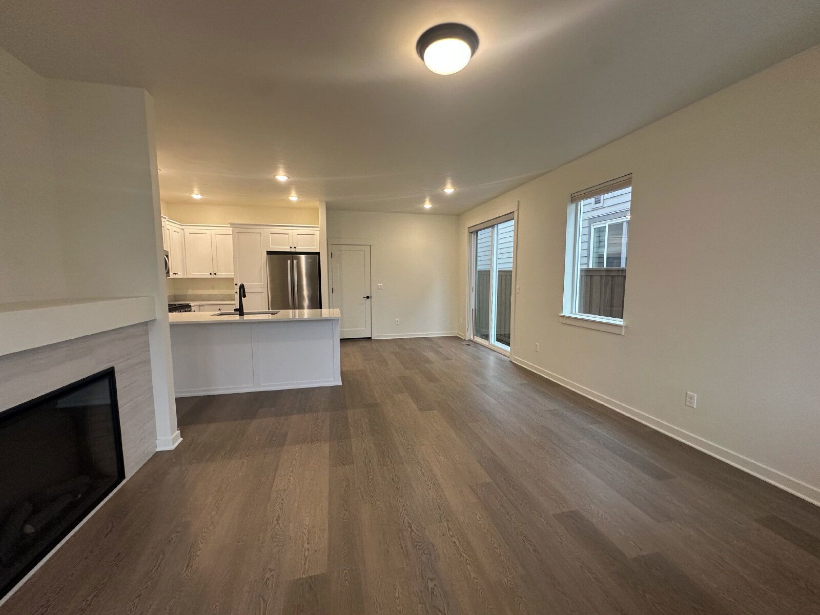 Enjoy a modern kitchen with quartz countertops and stainless steel appliances, plus a spacious master suite with walk-in closet and private bath. The upstairs also features a bonus loft and laundry room (washer and dryer included), while the main floor includes a gas fireplace and easy indoor-outdoor flow to a fenced side yard and private deck.