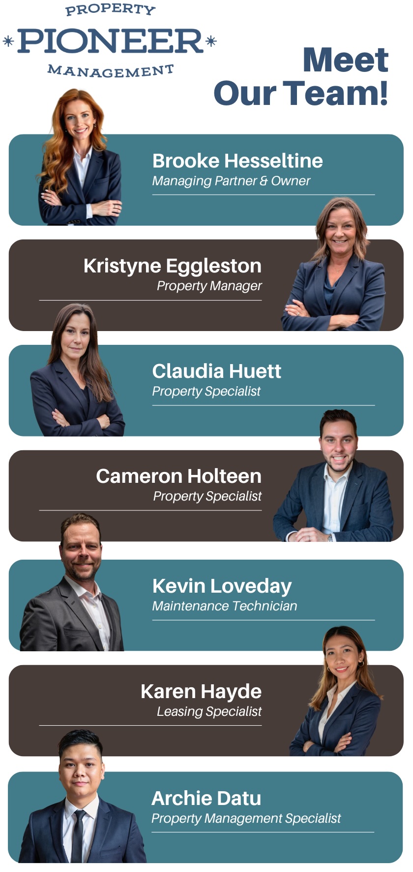 We believe great property management starts with a dedicated team, and at Pioneer Management, our experienced professionals work hard every day to ensure your rental properties are well-managed, tenants are taken care of, and your investments thrive. As a privately owned and operated company, we take pride in our knowledgeable and dedicated team. Our licensed property managers and experienced staff are committed to providing exceptional service and support to our clients.